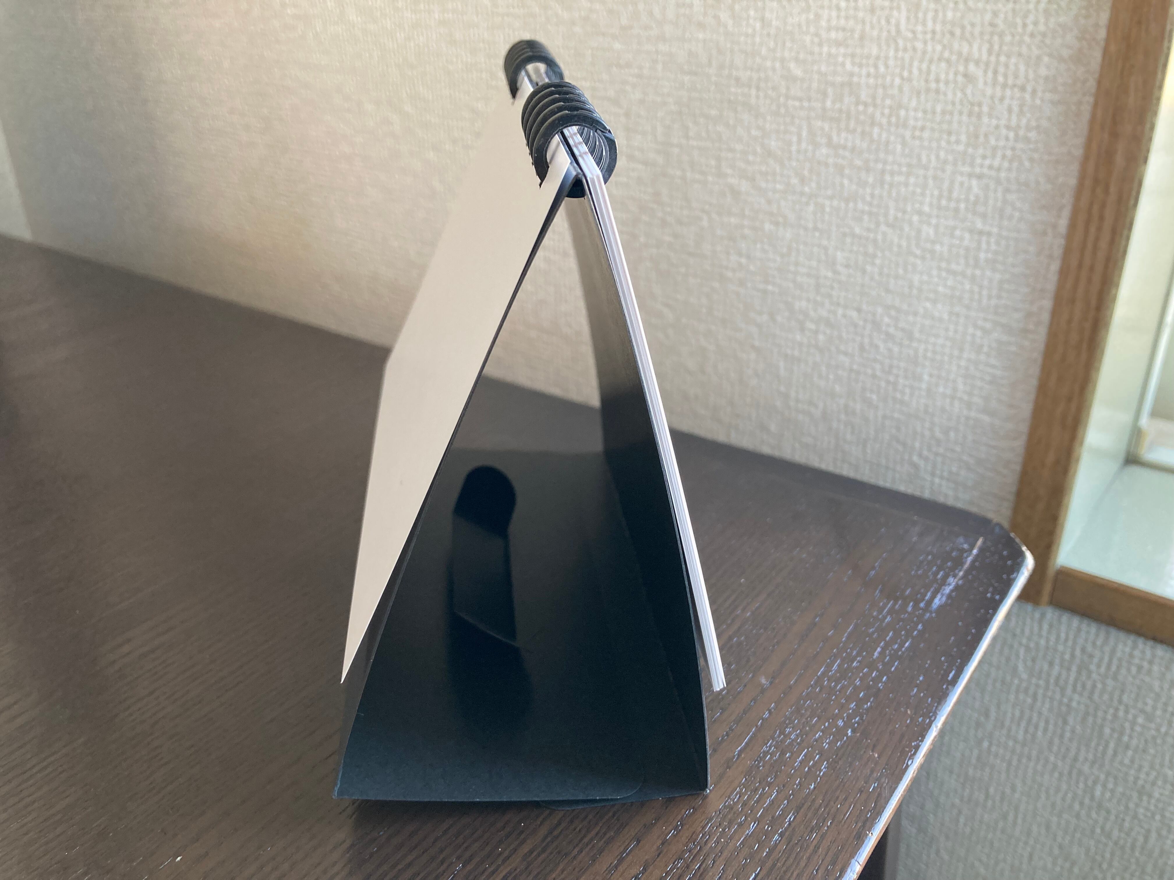 紙リング製で、折りたたみ可能な色合いが特徴です。使い終わった月は、リングから外せばメッセージカードとしても再利用できるスグレモノカレンダーです。