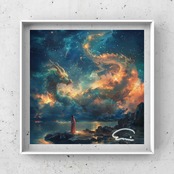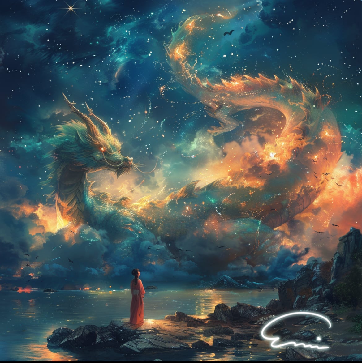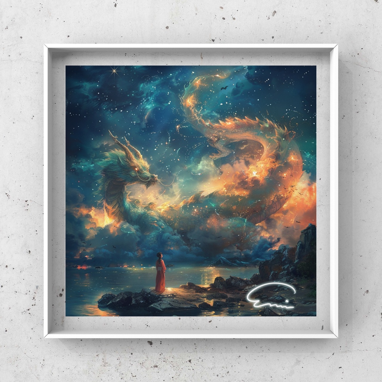 Created through collaboration between Midjourney and artist Emi, this work expresses the maiden's pure prayer and the heartfelt communion with a majestic, light-filled dragon deity. The water deity—the dragon deity—descends from the heavens to watch over the maiden gazing at the moon as she thinks of her beloved. The Milky Way is depicted as the dragon deity. The brightness of a full moon night is conveyed without depicting the moon itself, portraying the legend of Orihime and Hikoboshi separated by the Milky Way from the perspective of the maiden's prayer.