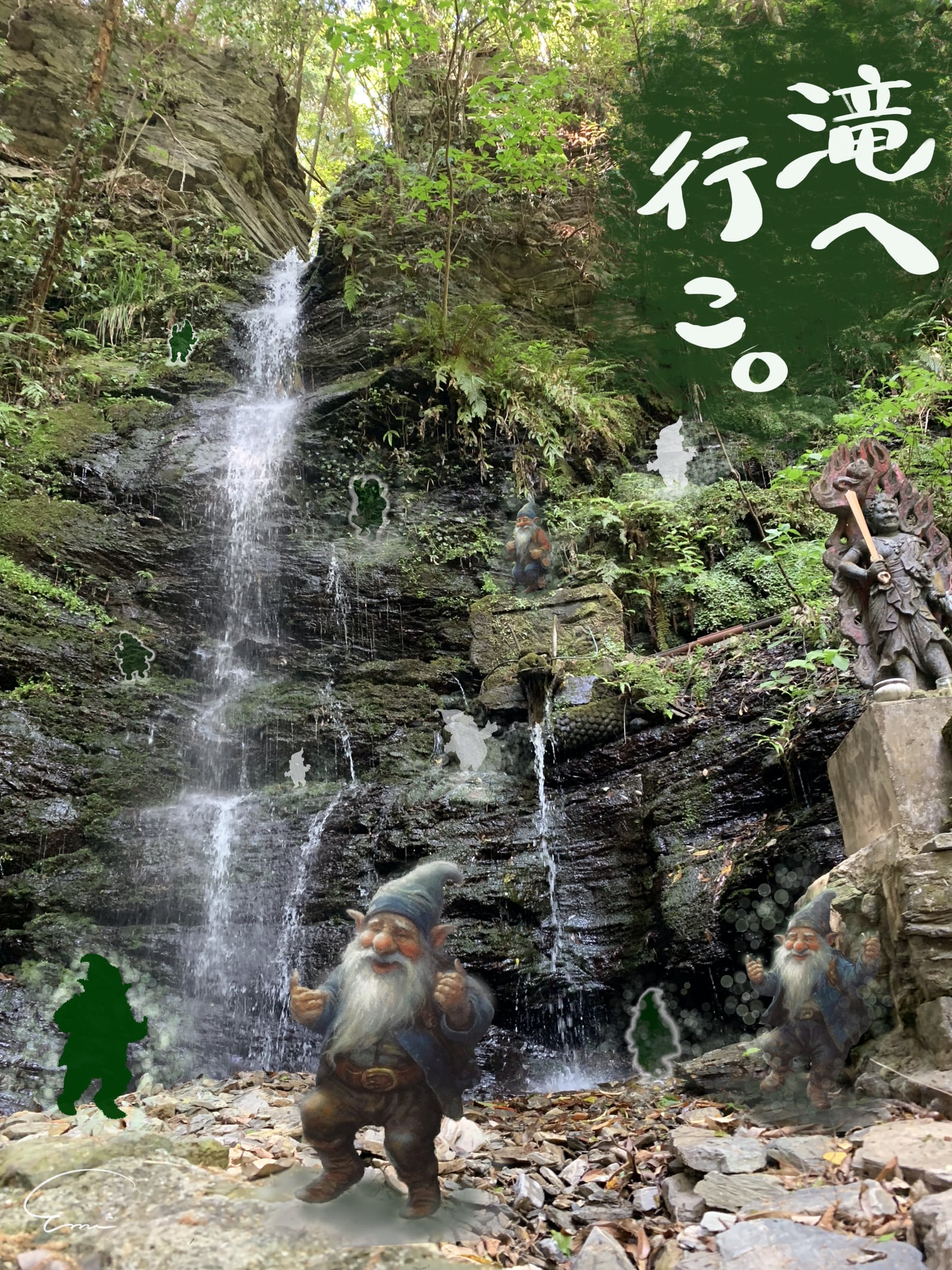 毎年、初詣で訪れていた延岡の大切な滝。その厳かな空気感と、私が大好きなAIアートの自由な発想を融合させた、世界に一つだけの景色です。AIと協働で描いた小人