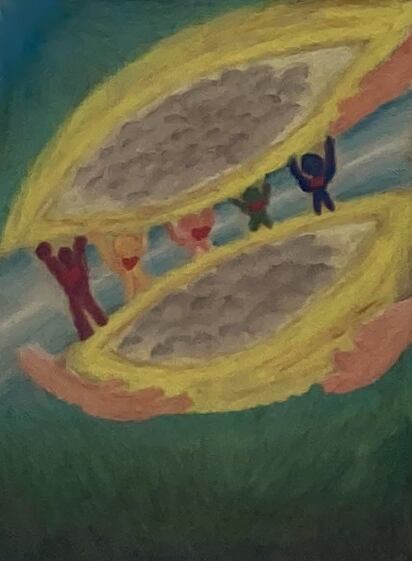 チョコレートの味を知らない子どもたちが多くいるカカオ農園の環境を良くしようと、フェアトレードや農園や工場を直接的に運営しようとする動きがあると知り、ハートのある子どもたちの手と、それを支える大人たちの手をカカオの実を中心において描きました。